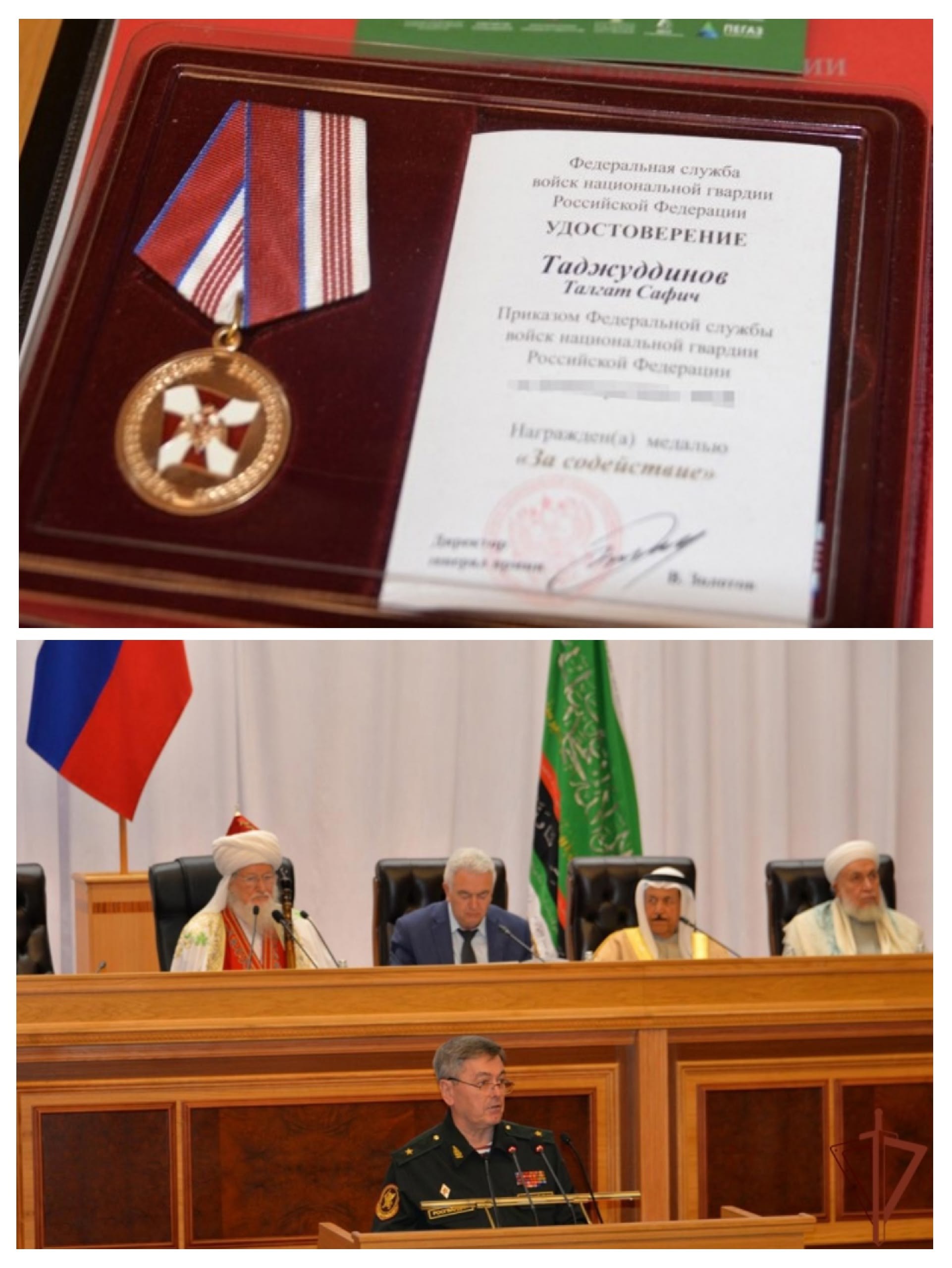 По поручению директора Росгвардии Героя России генерала армии Виктора Золотова Андрей Мальченко вручил Председателю Центрального духовного управления мусульман России Талгату Таджуддину ведомственную медаль «За содействие».