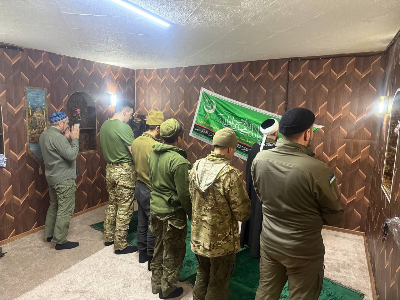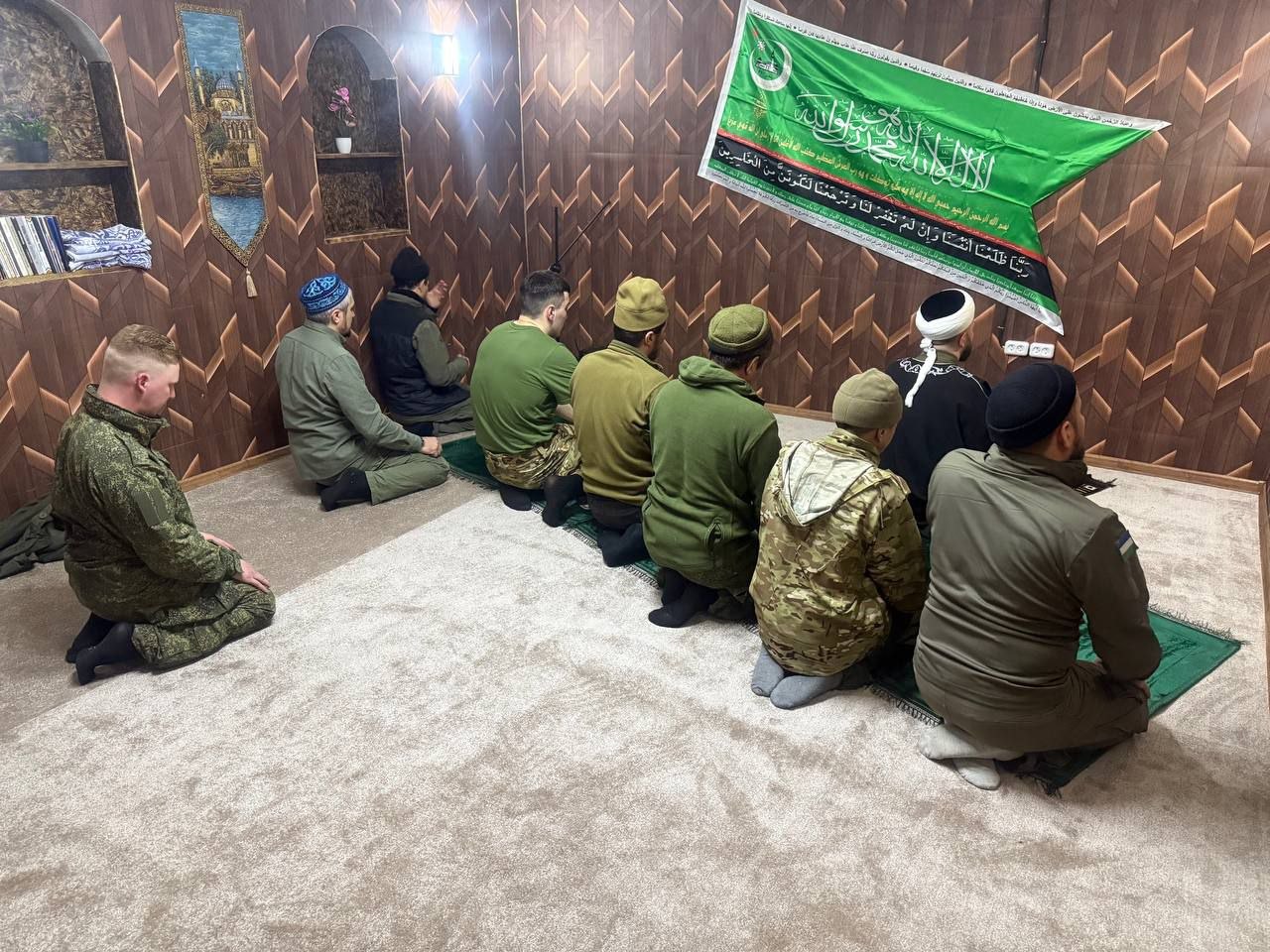 Временное молитвенное помещение оборудовали для военнослужащих-мусульман. Ахмад хазрат осмотрел место, пообщался с личным составом, после чего они совместно совершили намаз.